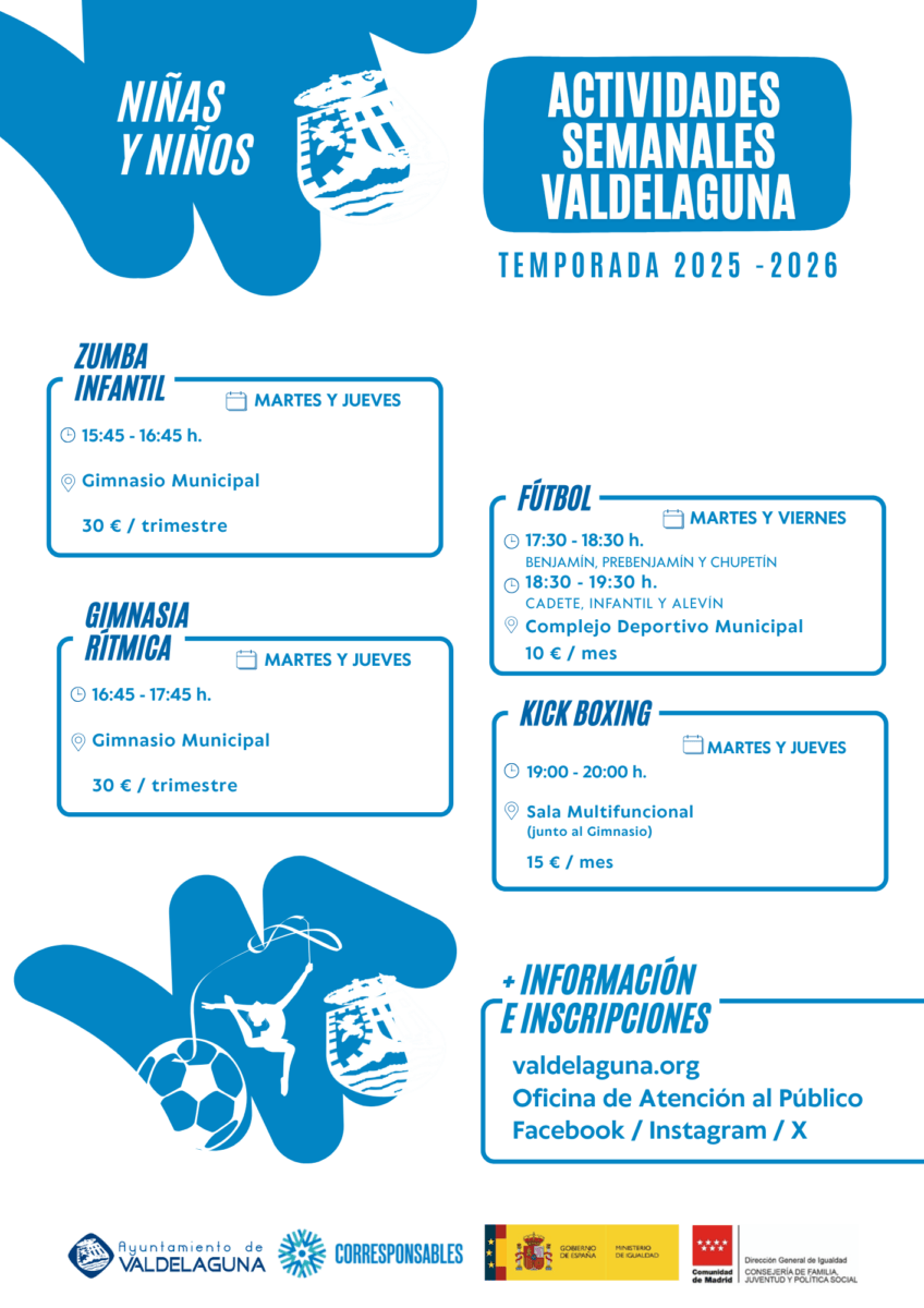 ActividadesEducación 4 de septiembre de 2025 admin FORMULARIO ACTIVIDADES TEMPORADA 2025 – 2026 NIÑOS Y NIÑAS *+ Información e inscripciones en la ESCUELA DEPORTIVA MUNICIPAL (Fútbol), hablando con el entrenador, martes o viernes de 17:30 a 19:30 Nombre y Apellidos *Edad *Dirección *Nº móvil / WhatsApp (padre/madre/familiar): *Actividad/actividades en la que te inscribes: *Zumba Infantil: martes y jueves de 15:45 a 16:45 h.Gimnasia Rítmica: martes y jueves de 16:45 a 17:45 h.Kick Boxing: martes y jueves de 19:00 a 20:00 h.¿Participaste en alguna actividad en la Temporada 2024 - 2025? Indica en cuál/cuáles en el apartado Observaciones *SÍNOObservaciones: Escribe en el recuadro de arriba cualquier consulta que quieras realizarNameEnviar Formulario niños Actividades Temporada 2025 – 2026