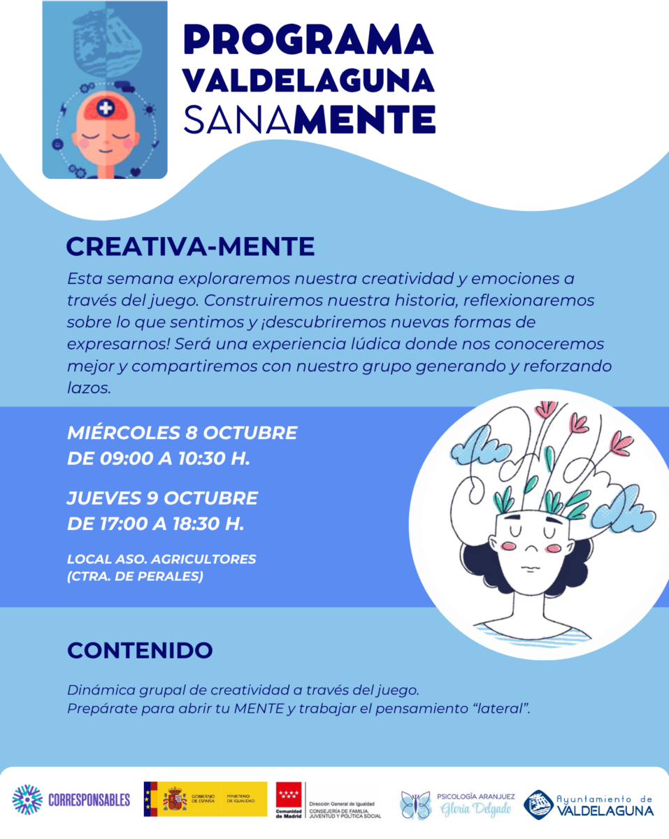 ActualidadAgendaSanidad 6 de octubre de 2025 admin 🤗 Taller Semanal «Valdelaguna SanaMente» 👨🏼🎨 «Creativa-mente» 🗓 Miércoles 8 de octubre, de 09:00 a 10:30 h. 🗓 Jueves 9 de octubre, de 17:00 a 18:30 h. 📍 Local de la Asociación de Agricultores (Ctra. de Perales) Taller «Valdelaguna SanaMente», 8 y 9 de octubre