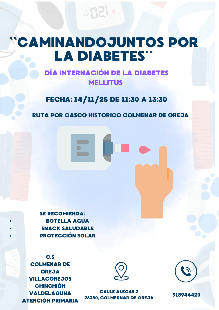 Con motivo del Día Internacional de la Diabetes Mellitus, los Centros de Salud de Colmenar de Oreja, Villaconejos, Chinchón y Valdelaguna organizan la actividad “Caminando juntos por la diabetes”, una ruta saludable y participativa por el casco histórico de Colmenar de Oreja.