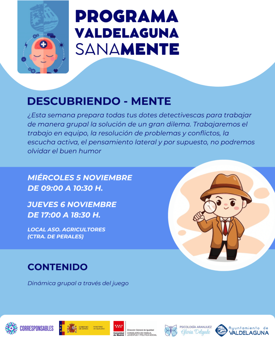 ActualidadAgendaSanidad 4 de noviembre de 2025 admin 🤗 Taller Semanal «Valdelaguna SanaMente» 🔎🧠 «Descubriendo – Mente» 🗓 Miércoles 5 de noviembre, de 09:00 a 10:30 h. 🗓 Jueves 6 de noviembre, de 17:00 a 18:30 h. 📍 Local de la Asociación de Agricultores (Ctra. de Perales) Taller «Valdelaguna SanaMente», 5 y 6 de noviembre
