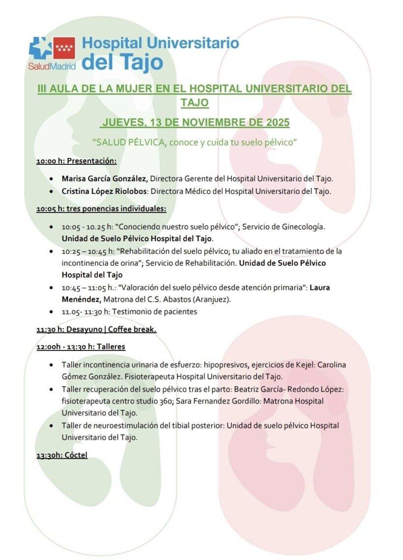 ActualidadAgendaSanidad 6 de noviembre de 2025 admin III AULA DE LA MUJER EN EL HOSPITAL UNIVERSITARIO DEL TAJO “Salud pélvica, conoce y cuida tu suelo pélvico». Jueves 13 de noviembre en el Salón de Actos del Hospital. Aula de la Mujer en el Hospital del Tajo